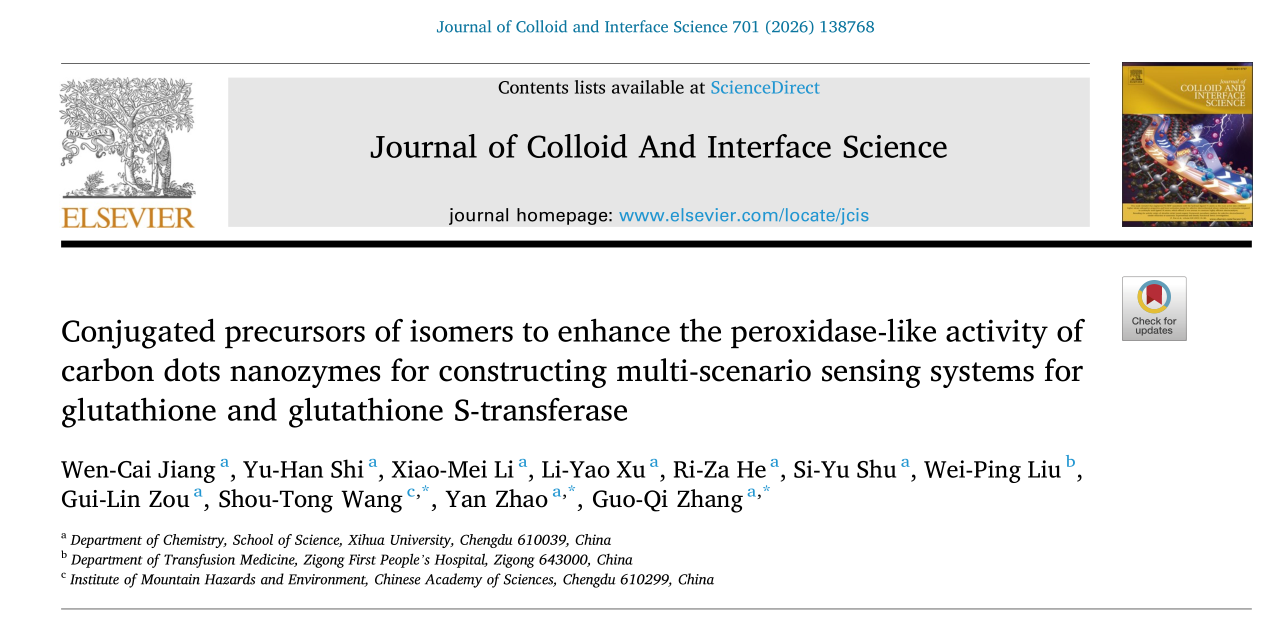 近日,理学院张国麒团队在国际权威期刊《Journal of Colloid and Interface Science》(中科院一区Top,IF=9.7)发表了题为“Conjugated precursors of isomers to enhance the peroxidase-like activity of carbon dots nanozymes for constructing multi-scenario sensing systems for glutathione and glutathione S-transferase”的研究性论文,西华大学2023级化学专业研究生蒋文彩为第一作者,张国麒博士、赵艳教授为该论文的通讯作者,西华大学为第一通讯单位。