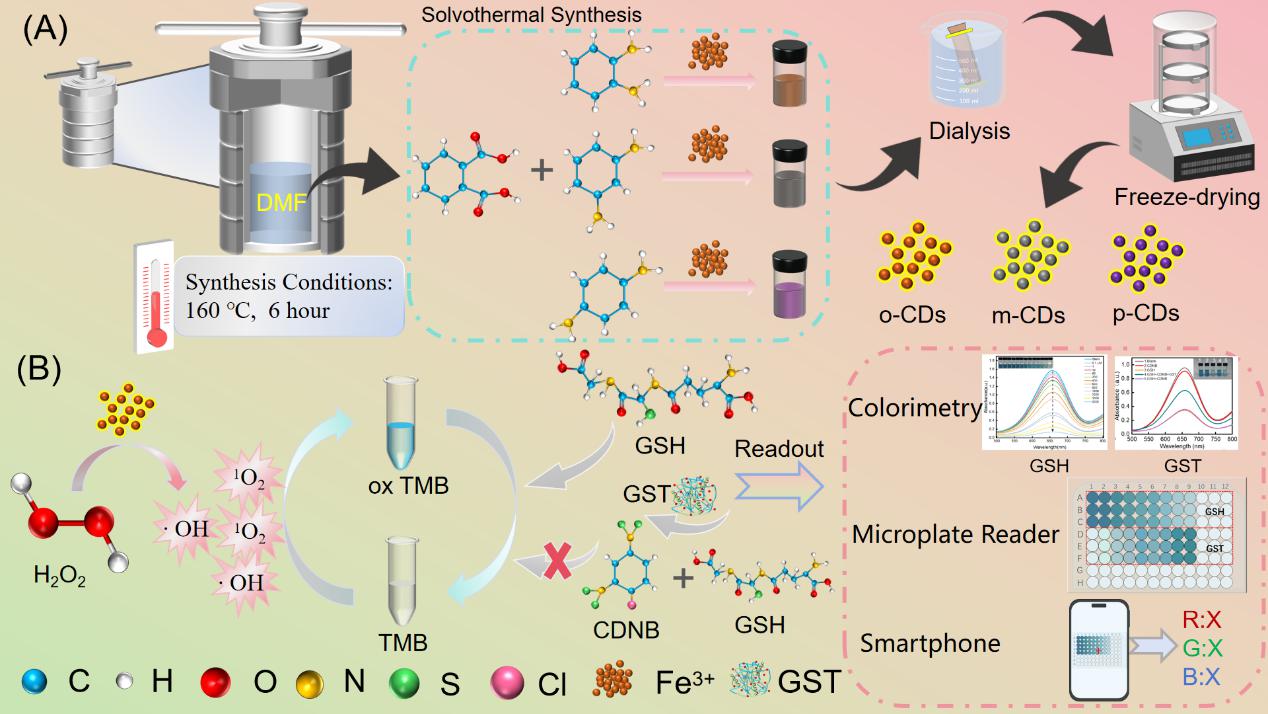 谷胱甘肽(GSH)和谷胱甘肽S-转移酶(GST)是人体内重要的生物标志物。GSH水平异常与肝损伤、肾癌和糖尿病并发症密切相关。例如,肝癌患者体内的GSH水平比健康人低40%-60%。GST活性升高则往往表明对抗肿瘤药物产生耐药性。传统的检测方法存在局限性:ELISA法操作复杂、耗时较长;色谱法需要昂贵设备;常规比色法易受干扰。该研究团队致力于开发一种简单、成本低、灵敏度高的方法,满足实验室高精度、临床高通量和现场便携式检测等不同场景的需求。通过调控共轭前驱体异构体结构,优化得到以邻苯二甲酸和邻苯二胺为前驱体,采用溶剂热成功地合成了具有良好催化活性和高稳定性的CDs纳米酶,显著增强了CDs纳米酶的过氧化物酶样活性,并成功构建了适用于实验室、临床和现场检测的多场景传感平台,用于谷胱甘肽(GSH)和谷胱甘肽S-转移酶(GST)的高灵敏度检测。
