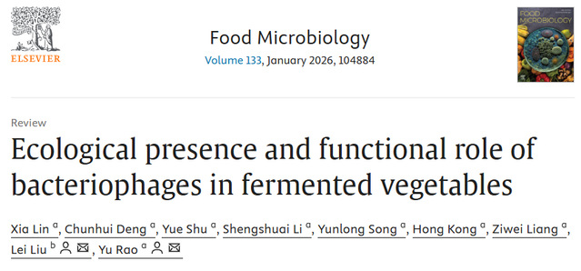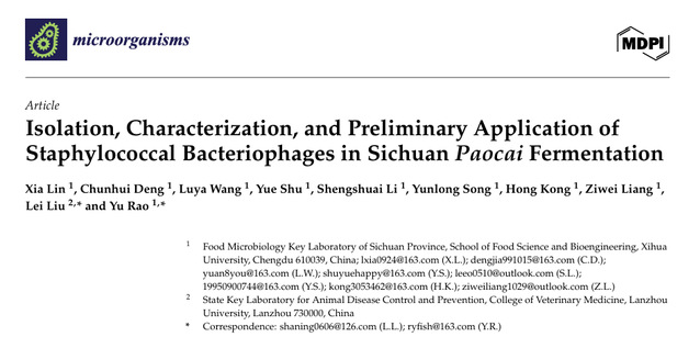 近日,食品与生物工程学院农产品贮藏与加工团队饶瑜教授等人在国际食品顶级期刊《Food Microbiology》(Q1,IF:4.6)发表题为“Ecological presence and functional role of bacteriophages in fermented vegetables”的综述论文。在国际微生物学领域权威期刊《Microorganisms》(Q2,IF:4.2)发表题为“Isolation, Characterization, and Preliminary Application of Staphylococcal Bacteriophages in Sichuan Paocai Fermentation”的论文。西华大学硕士研究生林霞为论文第一作者,西华大学饶瑜教授和兰州大学刘蕾青年研究员为论文共同通讯作者,西华大学为论文第一完成单位。