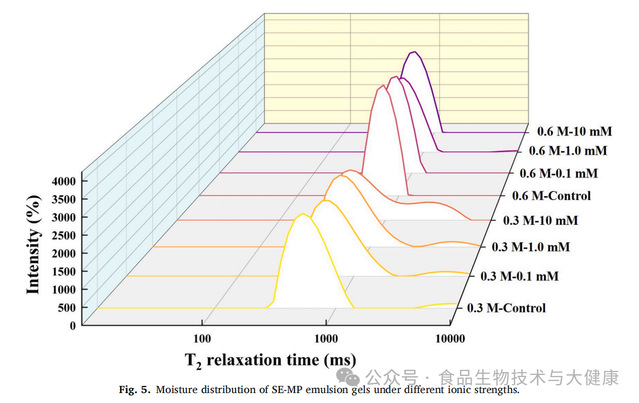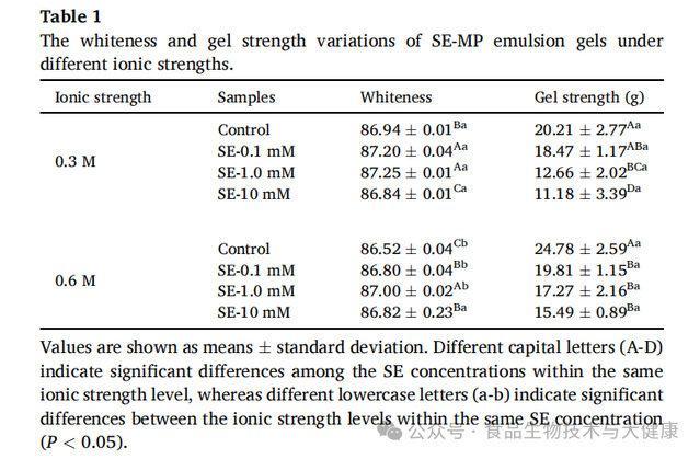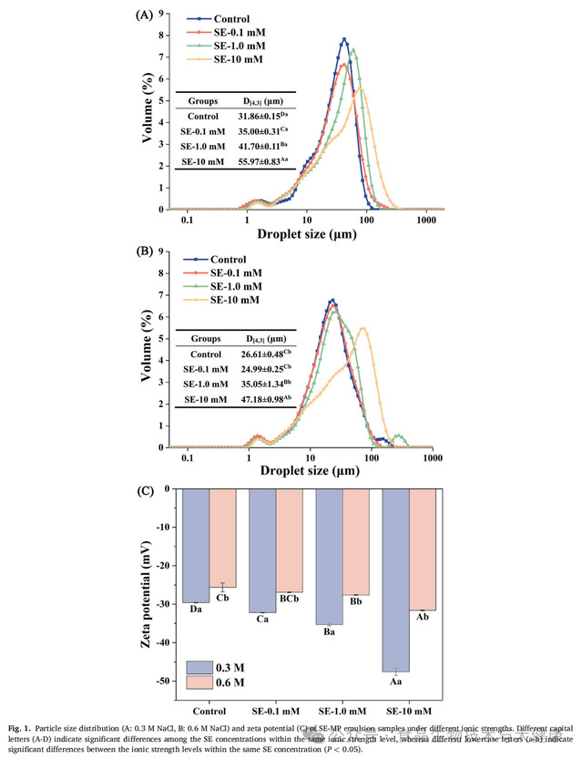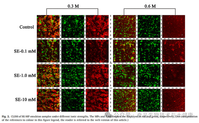 蔗糖酯(SE)是由蔗糖与脂肪酸酯化反应生成的天然低分子量非离子表面活性剂,具有优异的食品安全性与乳化性能。此前的研究发现,将肌原纤维蛋白与蔗糖酯复配使用,可提升肌原纤维蛋白在水相中的分散性及相互作用。因此,结合肌原纤维蛋白的盐依赖性溶解度及蔗糖酯的乳化特性,该研究选取两种具有代表性的离子强度条件(0.3mol/L和0.6mol/L氯化钠)与三个蔗糖酯浓度梯度(0.1mmol/L、1.0mmol/L和10mmol/L),旨在系统性阐明乳化体系与凝胶体系之间“液-固”相变的潜在机制,为乳化肉制品的质地创新提供具有参考价值的理论依据。