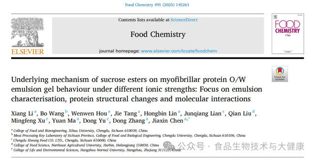 近日,食品与生物工程学院食品科学团队陈佳新老师等人在期刊《Food Chemistry》(IF:9.8)发表题为“Underlying mechanism of sucrose esters on myofibrillar protein O/W emulsion gel behaviour under different ionic strengths: Focus on emulsion characterisation, protein structural changes and molecular interactions”的论文。西华大学硕士研究生李翔为论文第一作者,西华大学陈佳新老师为论文通讯作者,西华大学为第一完成单位。