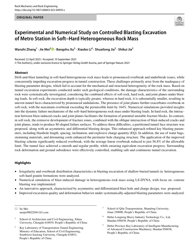 近日,建筑与土木工程学院张万志老师在国际知名TOP期刊《Rock Mechanics and Rock Engineering》(中科院一区TOP,IF:6.6)发表题为“Experimental and Numerical Study on Controlled Blasting Excavation of Metro Station in Soft–Hard Heterogeneous Rock Mass”的研究论文。西华大学建筑与土木工程学院张万志老师为论文第一作者,西南交通大学何川院士团队梅洁老师为通讯作者,山东大学李术才院士团队徐帮树副教授为第三作者。