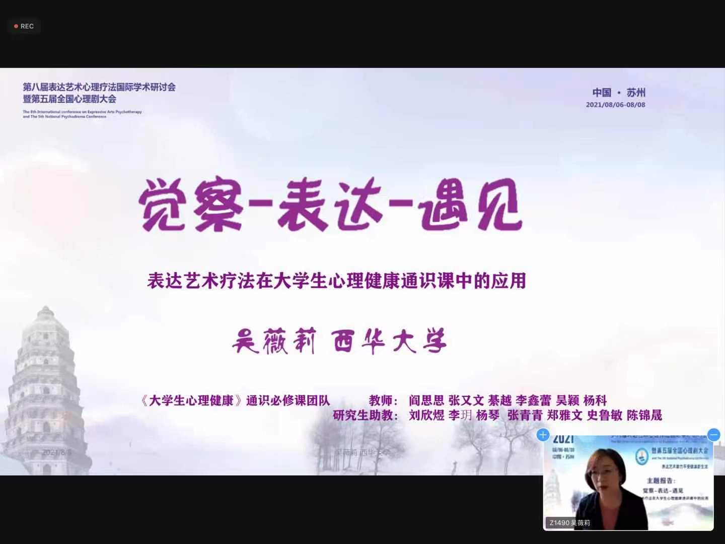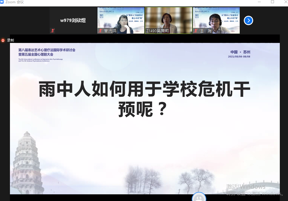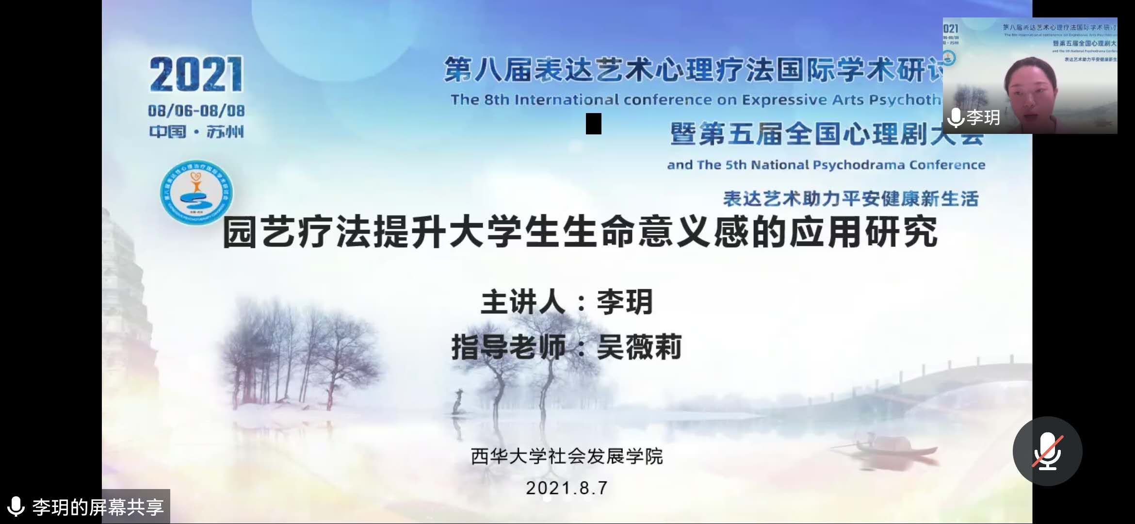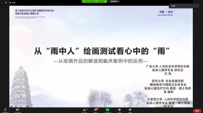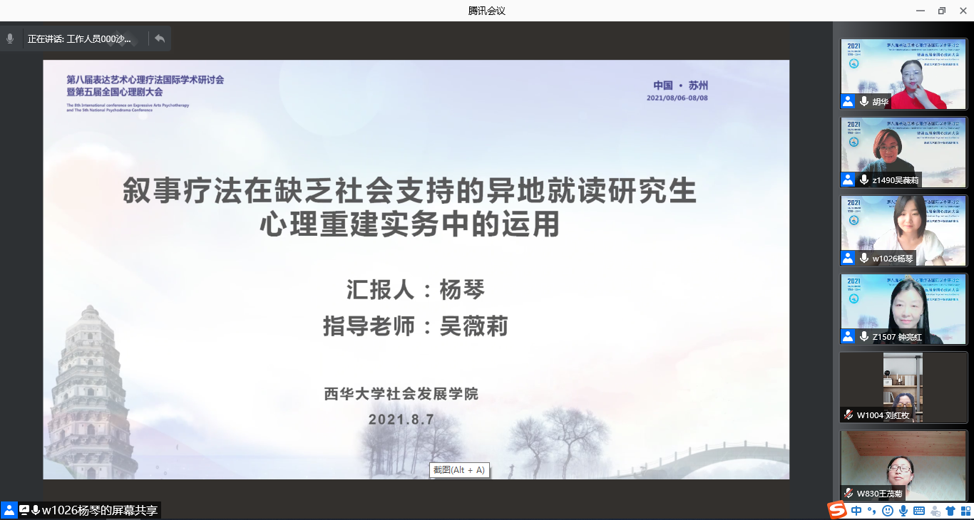 8月6日-8日,第八届表达艺术心理疗法国际学术研讨会暨第五届全国心理剧大会举行,此次大会由苏州市心理卫生协会、苏州新教育心理培训学校主办,中国心理卫生协会团体专委会(表达艺术学组、心理剧学组)、苏州市科学技术协会、苏州大学心理健康教育研究中心西交利物浦大学通识教育研究中心、日本艺术治疗协会协办。共计580余人参会,其中邀请的海内外专家有70余人,大会共开设网上主题报告9场,工作坊48场,论文交流8场,案例研讨3场。会议因疫情防控形势严峻,全程采取线上直播的方式进行,我校社会发展学院吴薇莉教授以及2019级社会工作专业硕士研究生刘欣煜、李玥和2020级社会工作专业硕士研究生杨琴参加了此次大会。