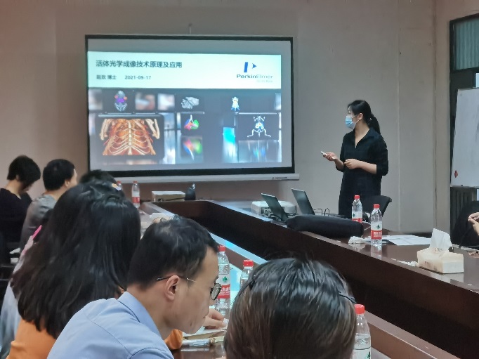 赵欢博士首先介绍小动物活体成像技术的基本概念及特点,结合近期发表在Angew. Chem.等高影响因子期刊上的文章详细讲述了该技术在肿瘤研究、化学探针研究、药物研发等疾病模型中的应用。另外,她提到目前市面上的成像仪器往往存在光照中心亮、边缘暗的情况,该公司的产品很好地规避了这一问题,她们推出的光谱拆分技术有待进一步优化,但值得期待。