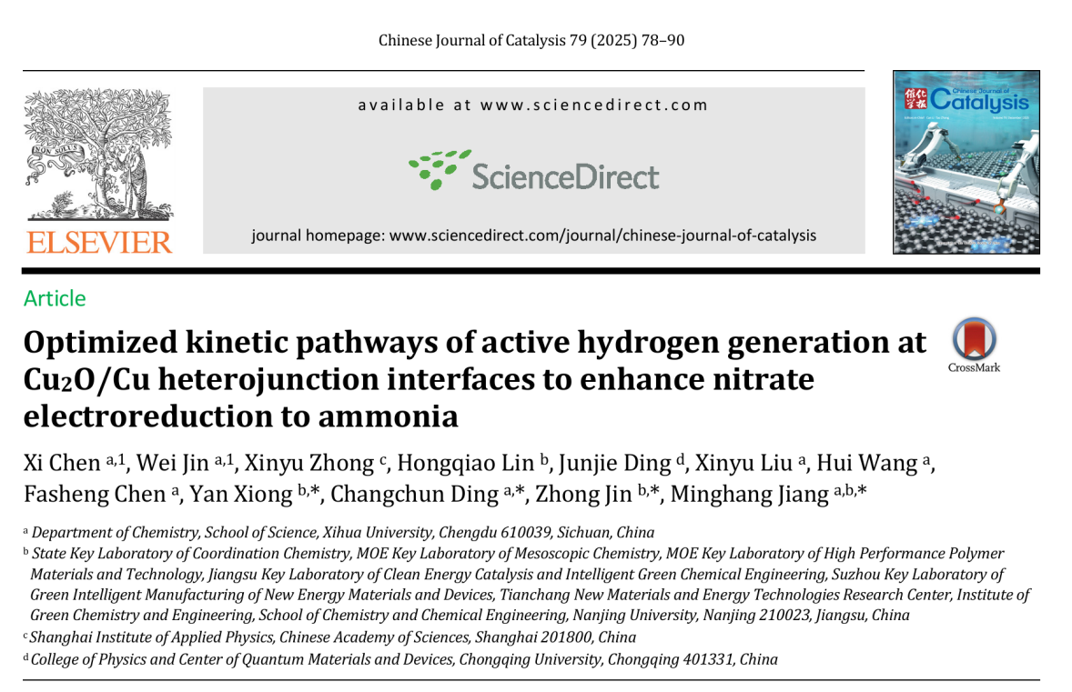 近日,理学院江明航副教授课题组及合作者在国际TOP期刊《Chinese Journal of Catalysis》(中科院一区,IF=17.7)发表题为“Optimized kinetic pathways of active hydrogen generation at Cu2O/Cu heterojunction interfaces to enhance nitrate electroreduction to ammonia”的研究论文。江明航副教授为该论文通讯作者,丁长春副教授和南京大学金钟教授、熊衍研究员为共同通讯作者,2023级硕士研究生陈羲和金伟博士为共同第一作者,西华大学为第一通讯单位。
