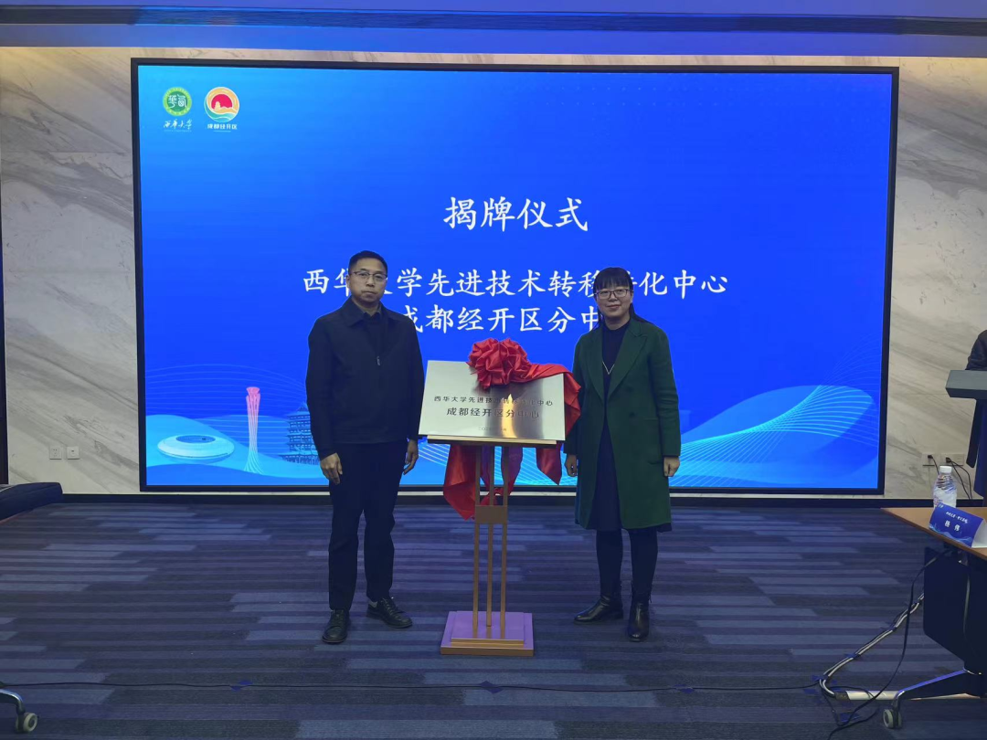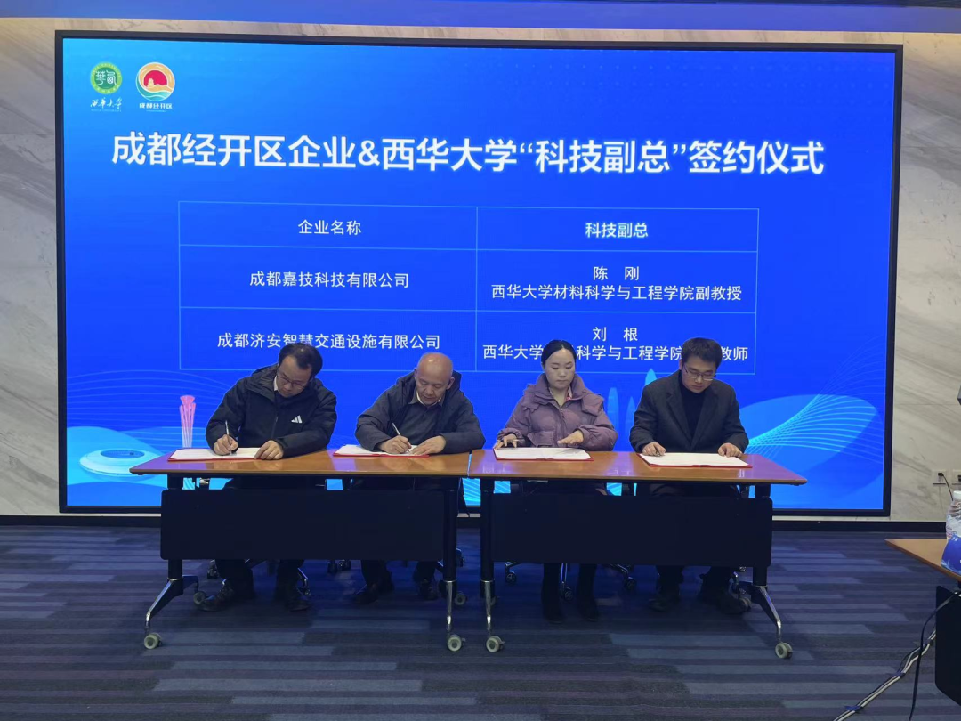 活动上,西华大学先进技术转移转化中心成都经开区分中心正式揭牌,标志着西华大学与成都经开区校地合作进入实体化、常态化运行新阶段。随后举行的成都经开区企业与西华大学“科技副总”签约仪式上,成都济安智慧交通设施有限公司、成都嘉技科技有限公司分别与西华大学材料科学与工程学院刘根老师、陈刚副教授签署合作协议,建立“一对一”深度技术合作机制,实现人才智力与产业需求的精准匹配。