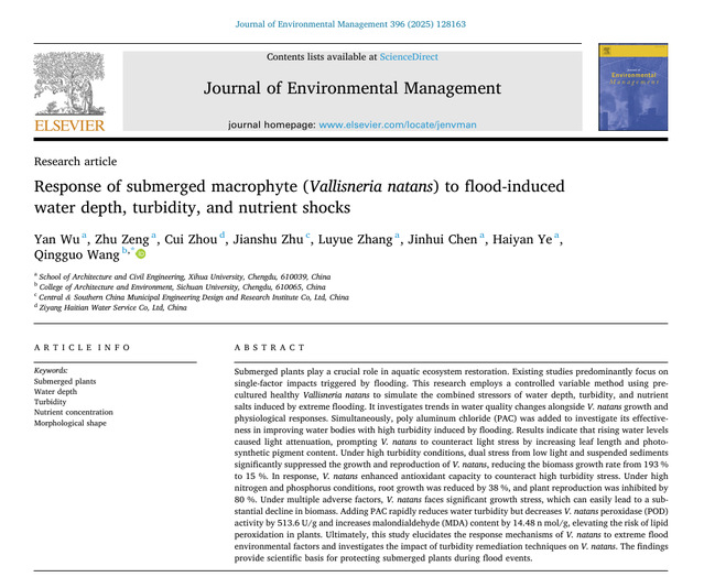 近日,建筑与土木工程学院吴燕副教授课题组在《Journal of Environmental Management》期刊(JCR一区,中科院二区Top,IF=8.4)发表题为“Response of submerged macrophyte (Vallisneria natans) to flood-induced water depth, turbidity, and nutrient shocks”的论文。论文以西华大学为第一单位,吴燕副教授为第一作者,2025级土木水利研究生曾珠为第二作者,四川大学王庆国副教授为通讯作者。