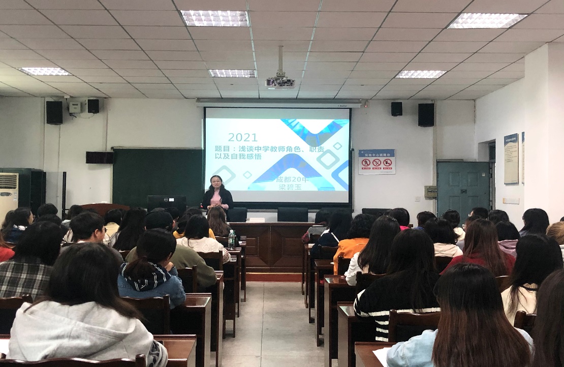 10月14日下午,为促进外国语学院与各中小学教学科研互动发展,更好地开展英语及相关专业学生教育实习工作,外国语学院邀请成都市二十中学初中部高级教师梁碧玉到学院作专题讲座。梁碧玉老师从中学教师角色、职责和自我感悟三个方面进行了教学经验分享。外国语学院唐利平老师,林晨军老师,2019级学生及部分研究生对梁老师的到来表示热烈地欢迎并认真地聆听了报告。