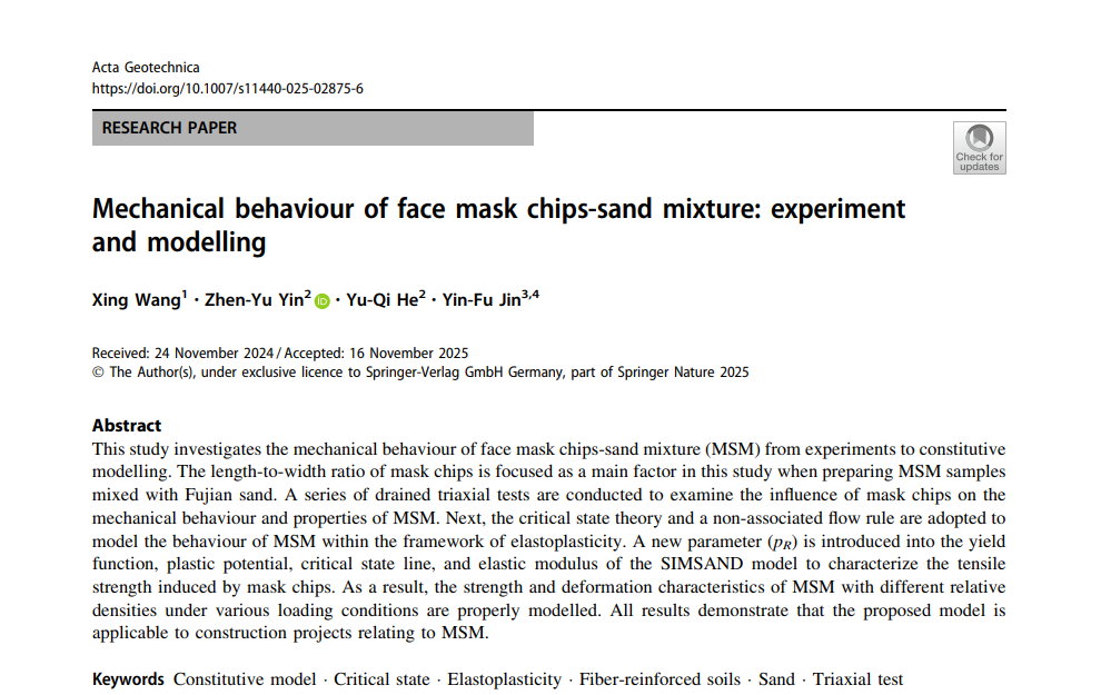 近日,建筑与土木工程学院道路与桥梁工程系教师王星博士作为第一作者在岩土工程领域主流期刊《Acta Geotechnica》发表题为“Mechanical behaviour of face mask chips-sand mixture: experiment and modelling”的研究论文。香港理工大学尹振宇教授为通讯作者,香港理工大学何玉琪博士、深圳大学金银富教授为论文参与作者,西华大学为第一单位。