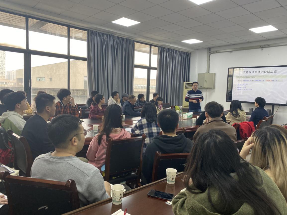 密文等值测试公钥加密是一种可以在不解密的情况下直接判断两个密文是否包含相同消息的加密技术,可用于完成一些需要保护用户隐私的计算任务。黄琼从特定的应用场景说明为什么需要研究密文等值测试公钥加密技术,并接着介绍可搜索加密的局限性,从而说明密文等值测试公钥加密技术有怎样不可替代的优点,紧接着介绍了密文等值测试公钥加密技术的发展历程,并对几个典型的密文等值测试公钥加密方案进行了介绍和研究思路的讲解,分析了几个方案的特点。最后讨论了密文等值测试公钥加密技术最新的研究现状,简要介绍了接下来的研究方向,同时黄琼还分享了在学术研究过程中遇到的问题和解决方法,让在座的师生都受益匪浅。