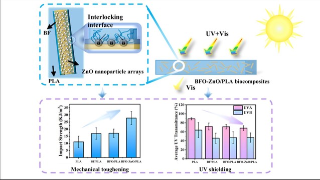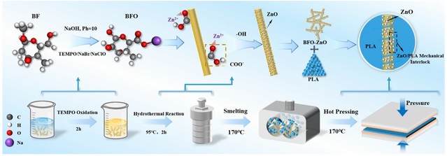 针对聚乳酸(PLA)脆性大、耐候性差的应用瓶颈,团队提出化学锚定-原位构筑协同界面调控策略。首先采用TEMPO选择性氧化在竹纤维(BF)表面引入羧基,作为金属离子的配位位点;进而以这些活化纤维为载体,通过低温水热法引导Zn²⁺选择性吸附和异相成核,促使ZnO纳米颗粒在纤维表面均匀、牢固生长。最后通过熔融共混、热压成型制备复合材料。