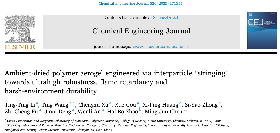 近日,理学院功能高分子材料绿色制备与循环利用研究团队在阻燃保温复合材料研究上取得新进展。相关成果发表在材料领域著名刊物《Chemical Engineering Journal》(中科院1区TOP,IF: 13.2)、《Materials Horizons》(中科院2区TOP,IF: 10.7)、《ACS Sustainable Chemistry & Engineering》(中科院1区TOP,IF: 8.0),第一作者分别为理学院化学专业硕士研究生李婷婷、勾雪和许成叙,通讯作者为汪婷副教授和陈明军教授,西华大学为第一单位。