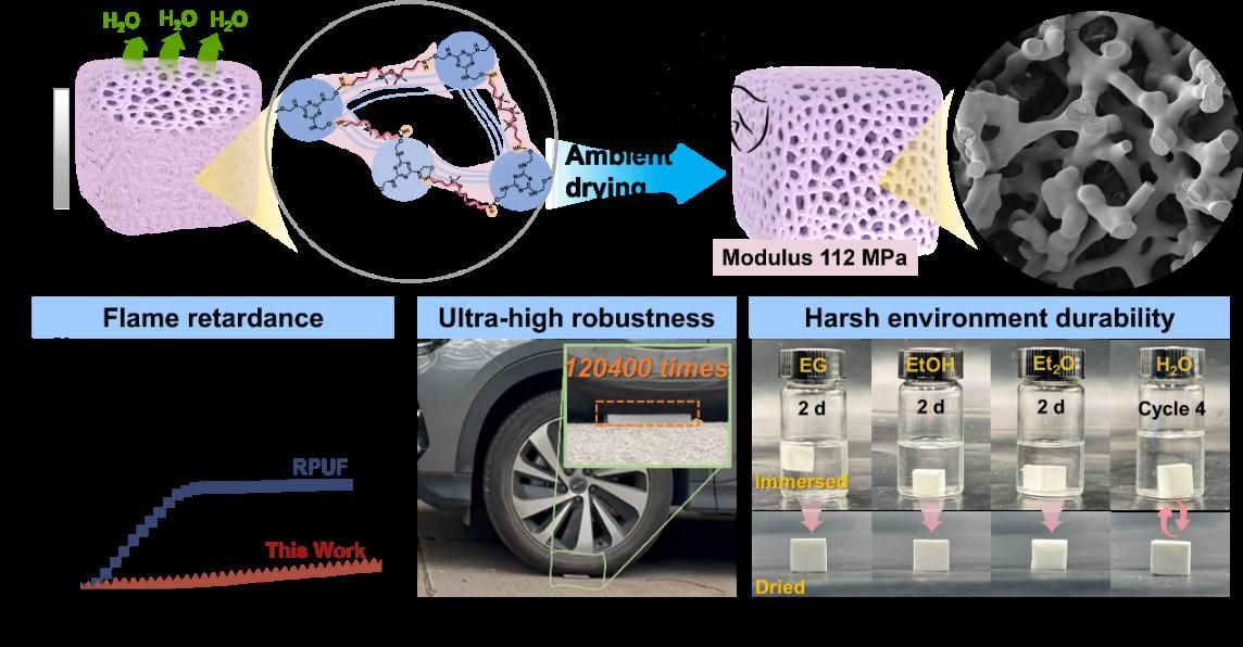 针对有机气凝胶易燃性、低模量、制备方法复杂等固有缺陷,本课题组创新提出“串珠策略”,以明胶为三维网络支撑模板、氨基封端PDMS为扩链剂,通过协同作用调控三聚氰胺甲醛树脂(MF)气凝胶的微观结构。不仅实现了绿色常压干燥,更将传统气凝胶的珍珠链状脆弱结构转变为致密、稳定的棒状组装体,赋予了气凝胶优异的综合性能和极端环境稳定性。气凝胶的压缩模量高达112 MPa,能经受2 t汽车碾压且结构不坍塌,还展示出优异的阻燃性能。在溶剂、高温等环境下仍能维持优异的机械性能和阻燃性能。这项低成本、易规模化的制备技术,将超高性能与绿色环保完美融合,为建筑、工业等苛刻环境下的保温材料提供了解决方案。