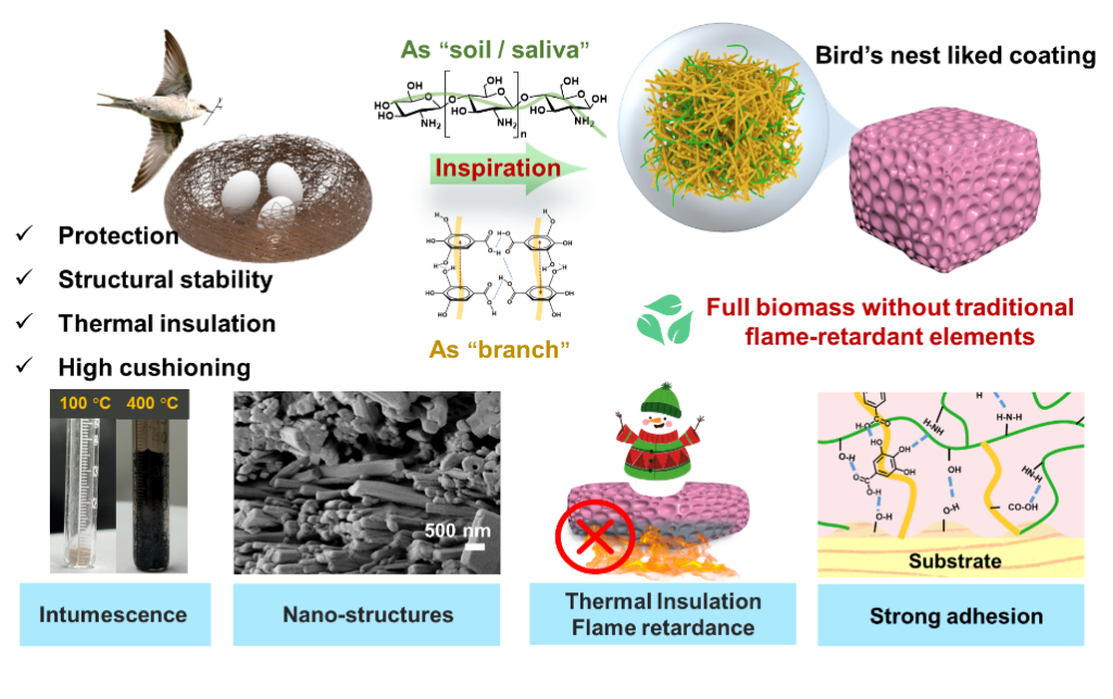 针对传统保温材料在阻燃改性恶化力学性能和保温性能的矛盾问题,且传统阻燃涂层与基材粘结力弱,易导致涂层剥离丧失阻燃性的难题,课题组受鸟类筑巢行为的启发,通过绿色多基团协同策略构建了一种不含传统阻燃元素的全生物质基防火涂料,实现了"一石多鸟"的效果。其中,没食子酸通过π-π堆积超分子纤维聚集体,模拟结构“细枝”;壳聚糖则通过复制“唾液”的粘合功能增强内聚力,两者组装形成具有纳米孔洞的互穿网络微结构。涂覆到聚氨酯硬泡上,其能赋予材料优异的隔热性能(24.85 mW·m-1k-1)和力学性能(压缩模量9.37 MPa)。得益于丰富的界面粘附基团和增强的内聚力,该涂层对多种基材均表现出强附着力。此外,脱羧/碳化过程与酚羟基自由基捕捉能力的协同作用,使材料具有膨胀阻燃行为和广谱阻燃特性。这项工作为开发具有巨大应用潜力的多功能阻燃涂料建立了一种简便环保的设计策略。