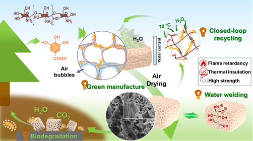 针对生物质气凝胶高度依赖不可逆的共价网络结构和复杂、高能耗的制备工艺来实现多功能化,导致生产成本上升,难以回收再利用等问题,课题组建立了一种简单、低碳的干燥方法,通过超分子可逆组装辅助气泡模板法,实现高效“锁泡”,构筑多功能生物质气凝胶。该气凝胶结合气泡孔结构与纤维组装的次级结构,实现卓越的隔热性能(30.4 mW·m-1k-1)、优异的机械性能(6.5 MPa)和阻燃性能。此外,基于热响应型交联网络的设计,气凝胶展现出全生命周期的可持续性,包括绿色制备、可修复性、闭环可回收性与可生物降解性。该方法避免使用有毒试剂,并显著降低制造与回收过程中的能源与资源消耗,为制备高性能、低碳足迹的下一代生物质气凝胶提供了一种环境友好策略。