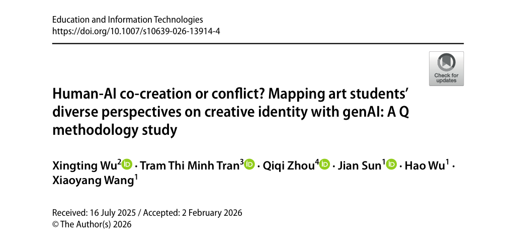 近日,音乐与舞蹈学院孙健副教授课题组联合澳大利亚斯威本科技大学、悉尼大学、荷兰布雷达应用科技大学的学者共同在教育学权威期刊《Education and Information Technologies》(SSCI一区,IF:5.4,IF排名:22/756)发表题为“Human-AI co-creation or conflict? Mapping art students' diverse perspectives on creative identity with genAI: A Q methodology study”的研究论文。该论文以西华大学为第一署名单位,孙健副教授为第一通讯作者,美术与设计学院吴昊副教授、王筱阳老师为共同研究人员。