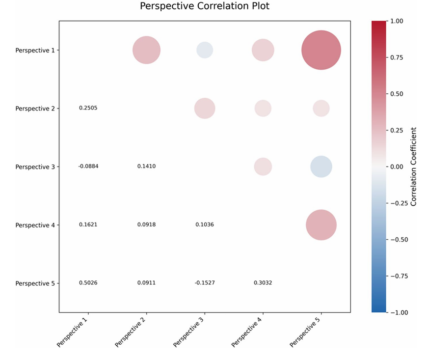 Fig. 2 Factor Score Correlations. Note. Numerical values represent the correlation coefficients between factors (perspectives). The color indicates the direction of the correlation (red = positive; blue = nega tive), and the dot size is proportional to the magnitude of the correlation coefficient. How to interpret this chart: For example, strong alignment (large red dots): A high positive value and a large red dot, such as the intersection of Perspective 1 (Directors) and Perspective 5 (Explorers) (r = 0.5026), indi cates these groups share significant common ground. Divergent views (blue dots): a negative value and blue dot, for instance, between Perspective 3 (Conflicted) and Perspective 5 (Explorers) (r = −0.1527), highlights a clash in perspectives.
