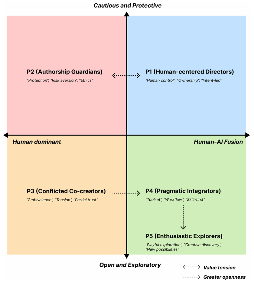 基于这一核心发现,团队构建了“创作作者权控制—AI 协同开放度”二维分析框架,结合中国文化与教育语境剖析了影响学生认知的关键因素,并针对五类学生提出了强化核心技艺培养、融入AI伦理教育、构建创作心理安全感等定制化教学策略,同时为设计人本导向的创作型 GenAI 工具提供了思路。