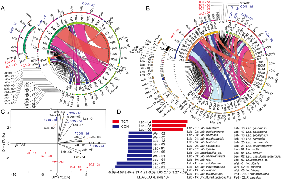 Fig.4.The distribution and succession of LABs in TCT and CON during the fermentation.