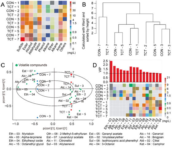 Fig.2. The distribution heat map and cluster diagrams of volatile compounds in TCT and CON during the fermentation.