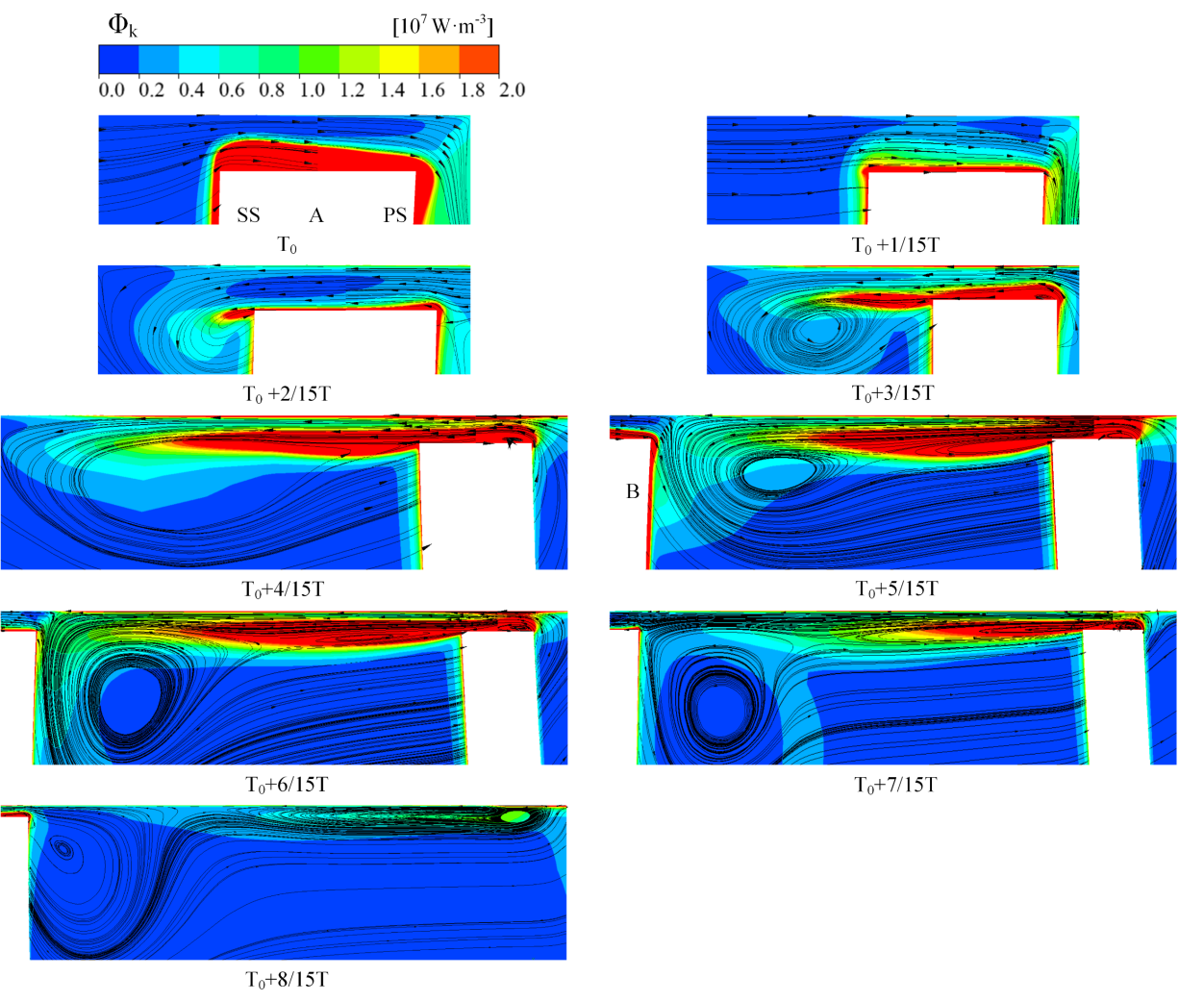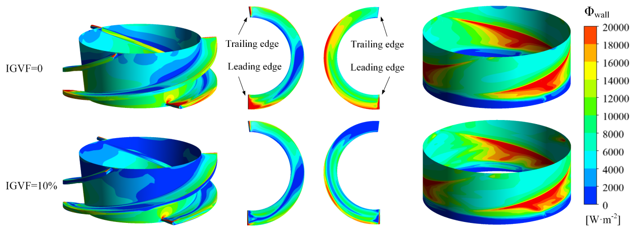 结果表明:混输泵叶顶泄漏涡结构包括前缘涡、叶顶分离涡、主泄漏涡、次泄漏涡和尾缘涡;在一个叶轮旋转周期内,叶顶泄漏涡的三维时空演化可分为分裂、收缩和合并三个阶段。相对涡旋拉伸项、科里奥利力和粘性扩散共同控制了叶顶泄漏涡的时空演化过程,是叶顶泄漏涡的涡量和轨迹变化的动力来源。气相的增加会恶化叶顶泄漏涡的流态,当含气率为10%时,体积旋涡拟能耗散功率增大45.33%,壁面旋涡拟能耗散功率减小23.90%,总旋涡拟能耗散功率增大17.21%。综上,通过研究深入揭示了叶顶泄漏涡对混输泵性能的内在影响。