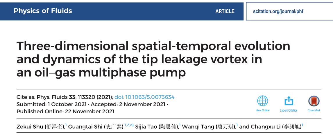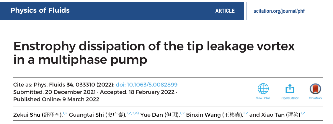 近日,我校能源与动力工程学院史广泰副教授团队硕士研究生舒泽奎在流体物理学领域权威期刊Physics of Fluids上连续发表2篇学术论文,中科院大类分区2区,论文题为“Three-dimensional spatial-temporal evolution and dynamics of the tip leakage vortex in an oil–gas multiphase pump”和“Enstrophy dissipation of the tip leakage vortex in a multiphase pump”。