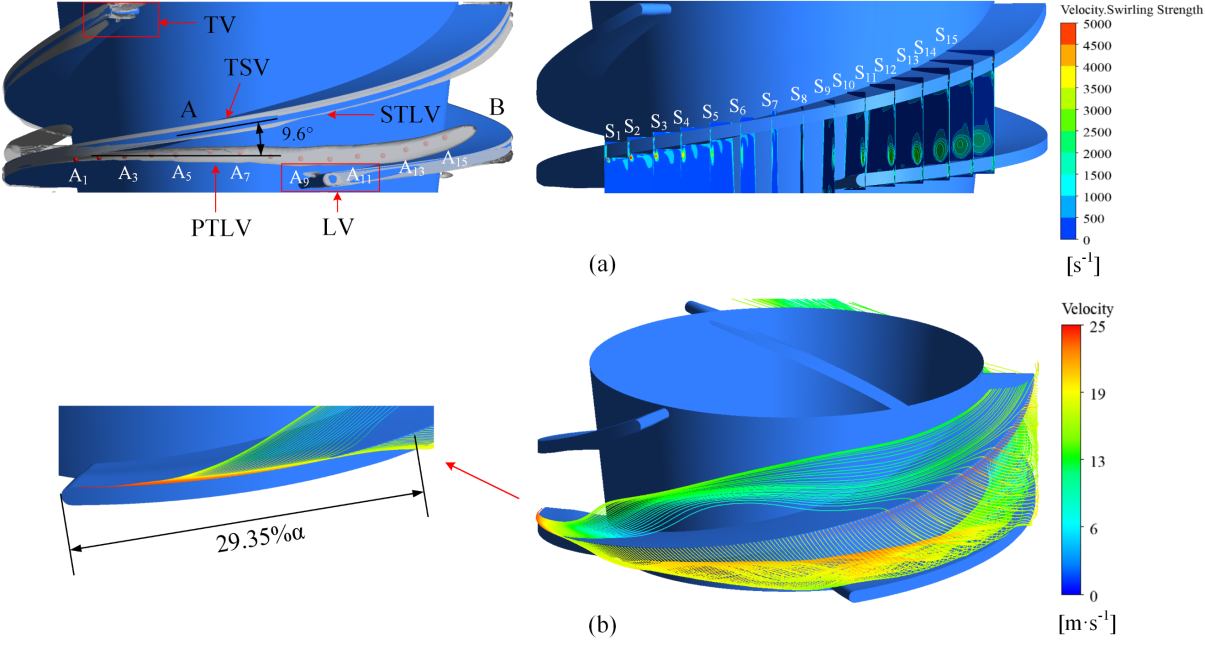 FIG. 1. Trajectory and 3D streamline of the TLV in the water condition. (a) TLV trajectory; (b) TLV 3D streamline.
