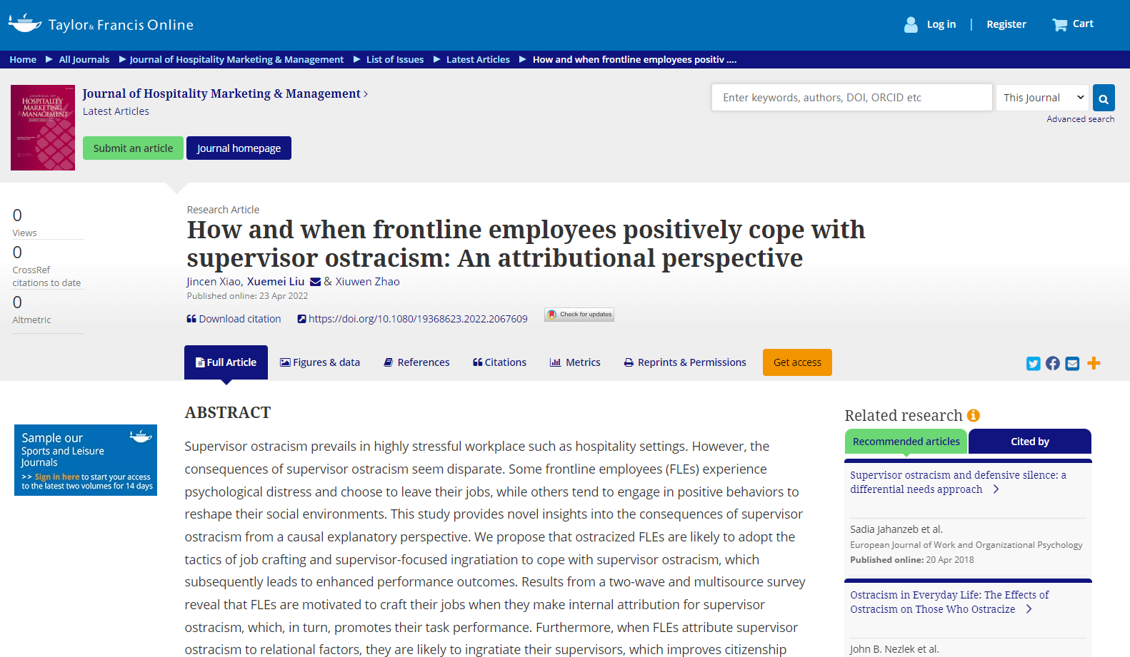 近日,我校管理学院赵修文教授带领的“数字经济时代下人力资源管理创新研究团队”在SSCI一区的国际期刊《Journal of Hospitality Marketing & Management》(IF=7.022)上发表了题为“How and when frontline employees positively cope with supervisor ostracism: An attributional perspective”的研究论文。