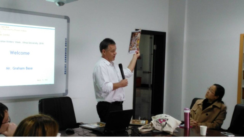 | 3月21日,“2016年澳大利亚文学周”讲座在我校图书馆澳大利亚研究中心报告厅开讲。来自澳大利亚的著名儿童绘本作家葛瑞米•贝斯为师生讲述了绘画与人生的故事。随行人员包括澳大利亚驻成都总领馆文化专员Brodie先生等。 葛瑞米•贝斯先生是世界图画书创作领域的佼佼者,其作品在世界范围内的广受赞誉。他1986年出版的《动物王国》,成为字母图画书的经典之作。葛瑞米•贝斯先生的系列绘本对于儿童在不同年龄阶段的认知水平发展方面起着获益匪浅的作用。参加讲座的观众中,不乏从小受其启蒙的澳洲留学生。 葛瑞米•贝斯先生风趣幽默的讲演风格和随性洒脱的自由个性时常引得在座同学们发出阵阵欢笑。会后,葛瑞米•贝斯先生与我校的师生以及本校和来自外校的澳洲留学生进行了热烈的交流和分享。 据悉, 澳大利亚文学周由澳大利亚驻华大使馆主办,旨在将澳大利亚最优秀的当代作家及其文学作品介绍到中国,展示澳大利亚独特的文学视角,为增进两国人民的理解和友谊做出贡献。我校澳大利亚研究中心自2008年起被澳大利亚驻华大使馆确定为“澳大利亚作家周活动”的定点举办单位。文学周活动每年3月举行,现已连续举办9届。该活动一直以来受到师生的好评,在增加我校与国际间交流的同时,也为我校师生体验澳大利亚文学文化、开展国际学术合作创造契机。