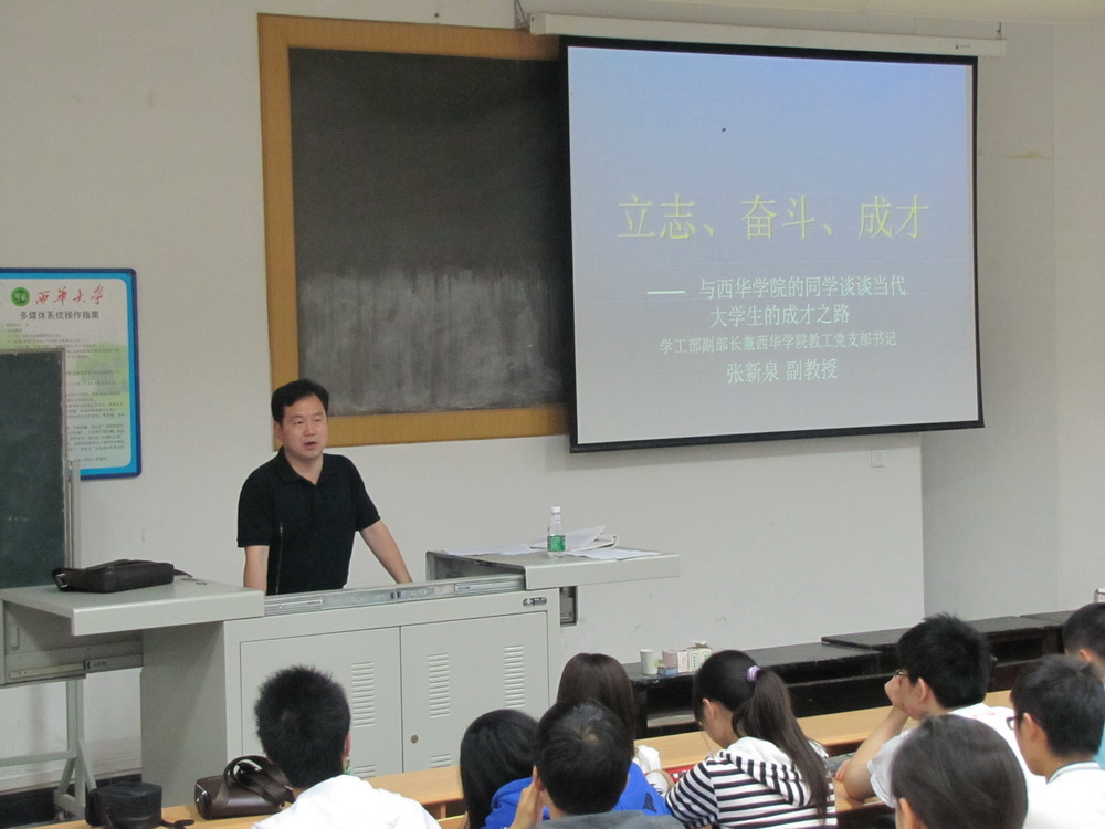 近日,西华学院党支部书记、学生工作部副部长张新泉在4A-307作了一场以“立志•奋斗•成才”为主题的专题讲座。西华学院全体同学以及办公室老师参加了本次讲座。 张新泉向同学们介绍了我校建校以来的一些杰出校友。从东方希望集团的董事长刘永行到全国政协常委、致公党中央副主席杨邦杰;从全国“劳模”王明华、罗兰到美国波士顿学院物理系终生教授任志峰。张新泉以历届西华大学优秀学子的成长、成才经历告诉西华学院学生“千里之行,始于足下”,要求我们全体同学要以杰出的前辈们为榜样,奋发图强。 接着,张新泉又详细地介绍了如何做好大学生学业生涯规划和职业生涯规划。 他亲切地嘱咐同学们:要“志存高远”,并且“善于设计自己”,“努力完成学校、学院所分配的任务,不要白白地浪费光阴”。作为西华学院的党支部书记,他又告诫同学们要端正入党动机,在思想上、行动上不断向共产党员的先进性靠进。 会场 |