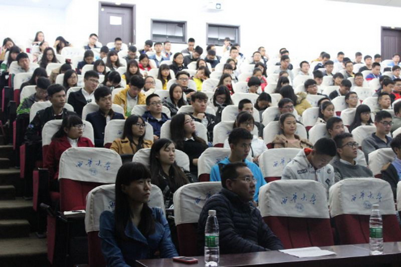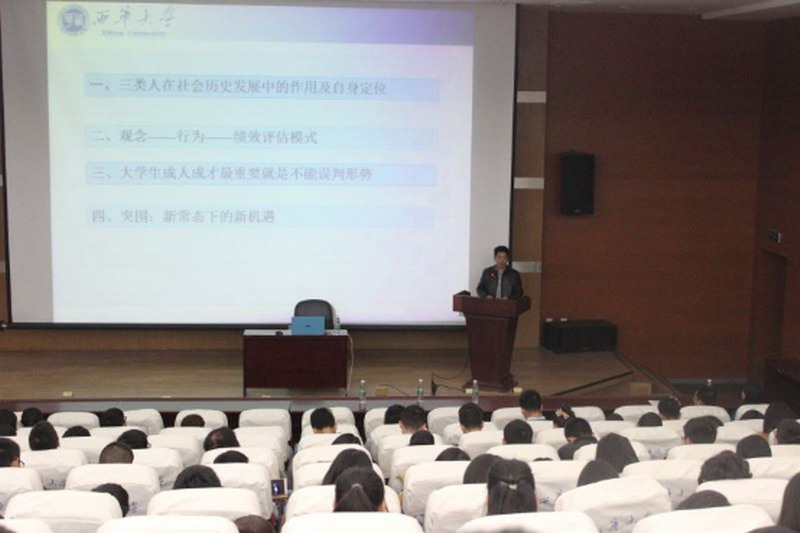 11月12日14:00,由建筑与土木工程学院主办、政治学院尹德志教授主讲的以“经济新常态背景下的新机遇与新挑战”为课题的西华讲堂在图书馆二楼报告厅开讲。学院党委副书记熊华,团委书记韩晶晶出席了本次讲堂。 讲堂一开始,尹教授用幽默诙谐的开场白介绍了何为经济新常态。接下来,尹教授立足于事实基础,以准确的数据来概括经济新常态的表现形式和描述了经济新常态下的社会背景,以亲身经历来提醒大学生面对经济新常态要未雨绸缪。 尹教授主要提出四点来让大家理解新常态的丰富内涵。第一点,尹教授指出了“指路人,领路人,走路人”三类人,并说明了各类人所具备的素养和在历史发展中的作用,希望大学生在这三类人中有自我定位。紧接着,尹教授讲解了"观念——行为——绩效评估模式"来让大学生树立正确价值观并落实行动。在最为精妙的第三点中,尹教授深入浅出地说明了误判形式是极其危险,并延伸到大学生如何判断形势。最后一点,即是“突围,新常态下的新机遇”。尹教授着重强调了大学生要怎样抓住新常态下的新机遇,同学们真是有“听君一席话,胜读十年书”之感。 正如熊华副书记在小结中所说,这次讲堂带给大学生们的不仅仅是新常态的丰富内涵,还有许多重要思想和对人生的抉择的正确导向。希望在这次西华讲堂结束后,大学生能在经济新常态背景下抓住新机遇,迎接新挑战。