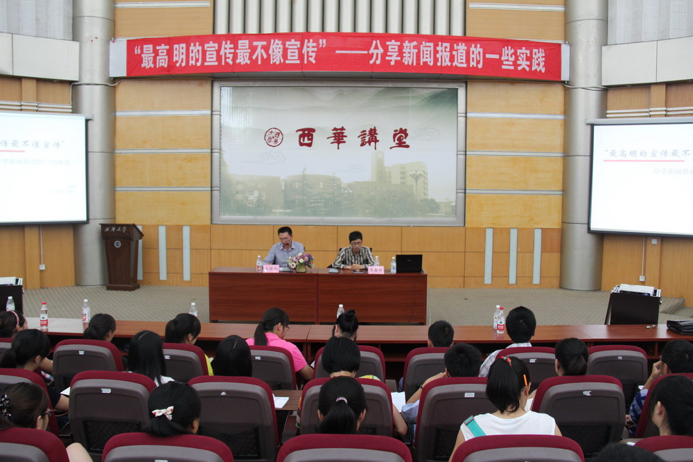 “再广大的悲伤也抵不过一个具体的悲伤。” 6月7日下午,《中国青年报》驻四川记者站资深记者王鑫昕应邀来我校,在四教报告厅做“最高明的宣传最不像宣传”的主题报告时如是说。 王鑫昕首先对《中国青年报》的情况做了一个详细的介绍,他提到《中国青年报》是为推动社会进步,服务青年成长,一切的宣传只为对得起“青年”两个字。 随后,他就新闻宣传优秀报道的三点特质做了详细的阐述和解释。新闻优秀报道的特质是新鲜、生动、启示。因为新鲜,所以值得一写;要想生动,就要抓住故事和细节;要有启示,就需要思想,还必须要挖掘事件背后蕴藏的启示和意义。他举例如《寻找廖雪梅》到之后的《廖雪梅来了》、冰点特稿《羌道难》、号称网络催泪弹的《永不抵达的列车》以及冰点特稿《回家》等例子来解释优秀报道的三点特质。 最后,王鑫昕还回答了现场同学诸如“怎样才能把经常报道的如运动会那样的新闻,报道出新意?”、“新闻事实是否等于新闻真实?”等问题,赢得了现场观众的阵阵掌声。 教职工宣传员、学生社团通讯员等聆听了报告。校团委书记蒋志勇主持报告会。