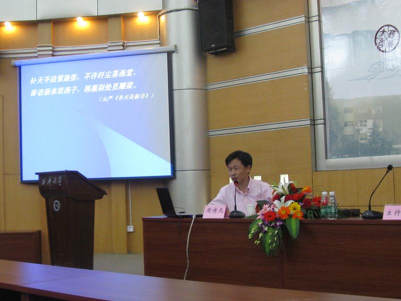 6月9日下午,由校团委主办、外国语学院承办的“西华讲堂——古典诗词艺术”在四教报告厅开讲。四川大学文学与新闻学院周啸天教授受邀前来与同学们交流古典诗词的艺术。对古典诗词具有浓厚兴趣的老师和同学们聆听了本次讲座,讲座由校团委副书记王博主持。 周啸天教授与同学们交流古典诗词 |