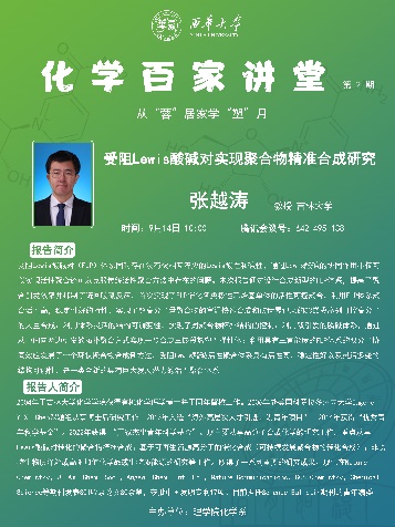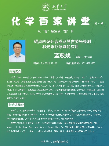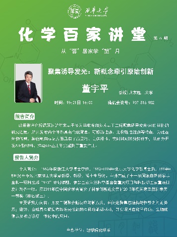 近期,理学院推出了化学百家讲堂,由化学系承办。围绕从“蓉”居家学“塑”九月主题,分别邀请电子科技大学孙旭平教授、吉林大学张越涛教授、北京化工大学许家喜教授、中南大学蓝敏焕教授、北京理工大学董宇平教授作有关纳米功能材料、受阻lewis酸碱实现精准合成、有机合成和立体化学、碳点设计和应用、聚集诱导发光等方面的学术报告,汤健钊顾问作线上Scifinder学术技能培训。