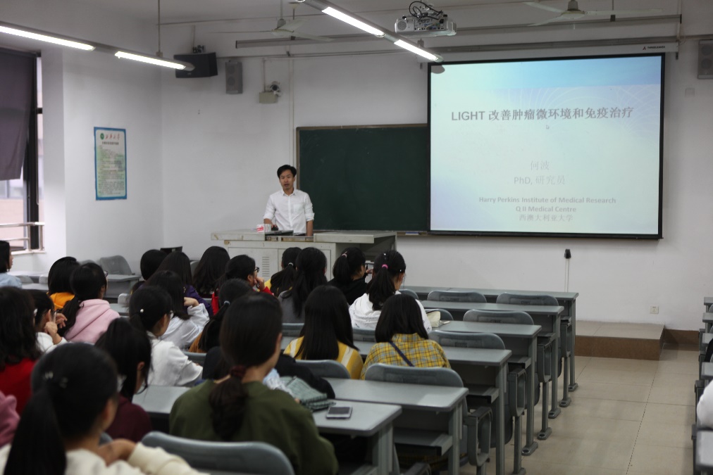 10月17日下午四点,应大健康管理学院的邀请,澳大利亚大学留学博士后何波研究员在5B-403教室作了一场名为“LIGHT改善肿瘤微环境和免疫治疗”的学术报告。报告会由学院刘媛琪博士主持,学院全体老师和学生参加。