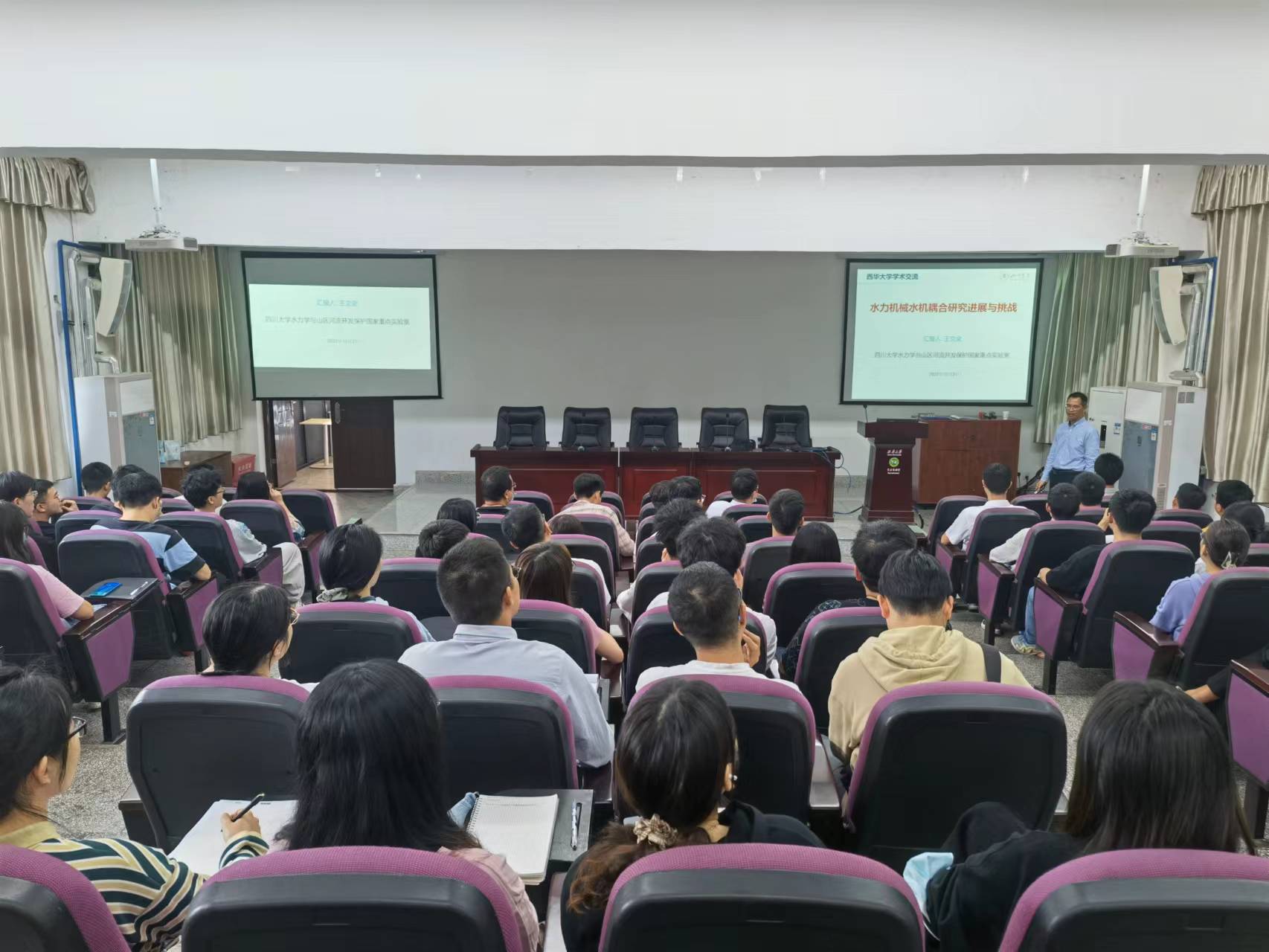 10月21日下午,四川大学水利水电学院能源与动力工程系王文全教授应邀在1B-201为我校师生作了主题为“水力机械水机耦合研究进展与挑战”的学术报告。能源与动力工程学院相关专业教师以及研究生参加了学术报告会。报告会由能源与动力工程学院党委书记江启峰主持。