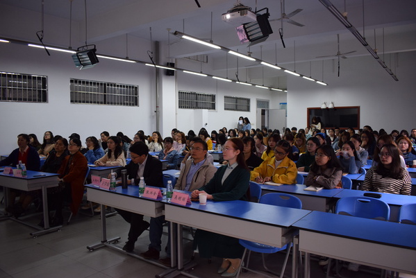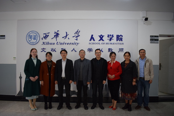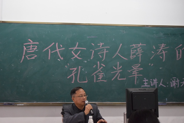 10月23日上午,人文学院在6A-126举办了“人文新视野”系列学术讲座之《唐代女诗人薛涛的“孔雀光晕”》。此次讲座由成都薛涛研究会副会长谢天开教授主讲。成都薛涛研究会秘书长汪辉秀,以及理事张兴全、周渝霞、吴明丽、刘燕君,人文学院院长谢应光、副院长王学东参加讲座。讲座由王学东副院长主持。