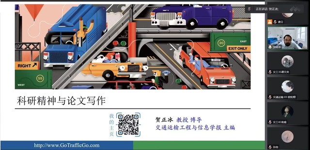 11月23日下午,汽车与交通学院开展了第六期“交通工程四川省一流专业系列学术讲座”。北京工业大学贺正冰教授应邀通过线上的方式为我校师生作了主题为“科研精神与论文写作”的学术报告。汽车与交通学院百余名本科生和研究生参加本次会议,唐立副教授主持会议。