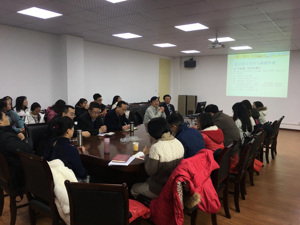 12月20日,四川大学商学院干胜道教授应管理学院邀请在3E-402作主题为“会计论文写作与课题申请”的学术报告。报告会由管理学院院长谢合明教授主持,学院副院长牟绍波、周佩,相关学科教师、新进博士教师代表及60余名研究生、本科生参加了报告会。
