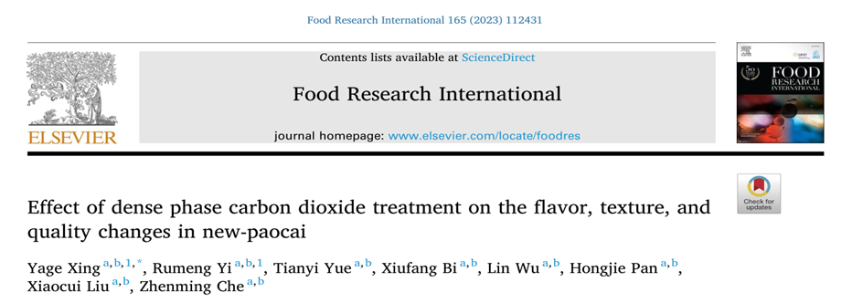 近日,西华大学食品与生物工程学院 “农产品贮藏与加工”团队邢亚阁教授在Food Research International(一区,IF: 7.425)上发表题为“Effect of dense phase carbon dioxide treatment on the flavor, texture, and quality changes in new-paocai”的研究论文。