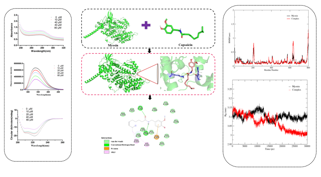 这项研究中,使用多光谱、分子对接和分子动力学模拟方法研究了MPs和CAP之间的相互作用机制,探究CAP与MPs之间相互作用机理。紫外光谱分析结果显示,CAP与MPs形成了复合物。荧光结果分析表明,CAP与MPs之间的相互作用改变了蛋白Trp和Tyr残基的微环境。CAP的添加致使MPs发生荧光猝灭,结果表明,CAP可以与MPs自发结合(Ka = 3.31 × 104 L/mol,n = 1.09)。CD测量表明,与CAP结合后,MPs的构象发生了变化,α-螺旋结构减少。肌球蛋白是MPs的主要蛋白质,因此肌球蛋白被选择作为与CAP结合的受体。分子对接和动力学模拟的结果表明,CAP能以较低的结合自由能(-4.86 KJ/mol)与肌球蛋白结合,其中肌球蛋白通过Lys-432和Lys-599与CAP形成氢键,而Ala-429、Asp-598和Pro-603与CAP形成疏水键。这两种类型的键都促进了复合物的形成并确保了它们的稳定性。该研究揭示了CAP和MPs之间的相互作用机制,为精确调控辣味和改善川菜肉类菜肴的质量特性提供了更加充分的理论支撑。