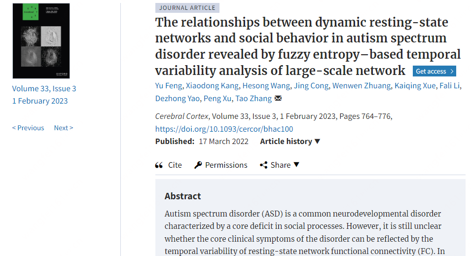 该论文通过模糊熵的方法,定义了脑网络变异性,揭示了ASD的脑网络模式。该论文第一作者为2019级理学院研究生冯毓(电子科技大学在读博士),张涛导师为通讯作者,《Cerebral Cortex》(中科院大类2区,Top,IF = 4.86)。