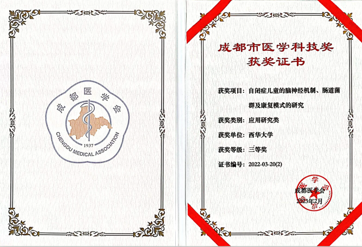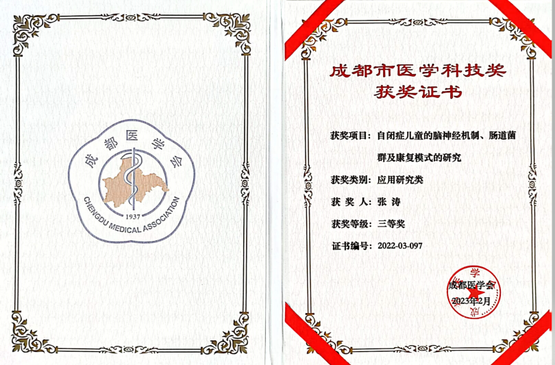 张涛副教授参与的《自闭症儿童的脑神经机制、肠道菌群及康复模式的研究》项目,获2022年度成都市医学科技奖三等奖。