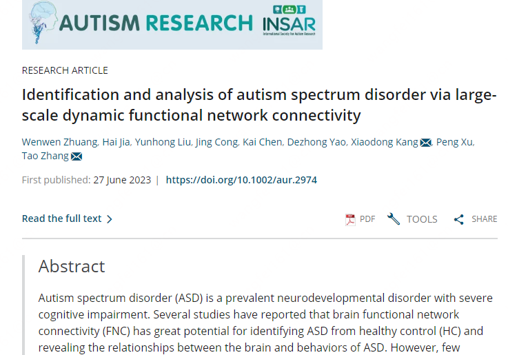 该论文通过动态大尺度脑网络,构建了ASD预测模型。该论文第一作者为2020级理学院研究生庄雯雯(暨南大学攻读博士),导师张涛为通讯作者,《Autism Research》(中科院大类2区,IF = 4.7)。